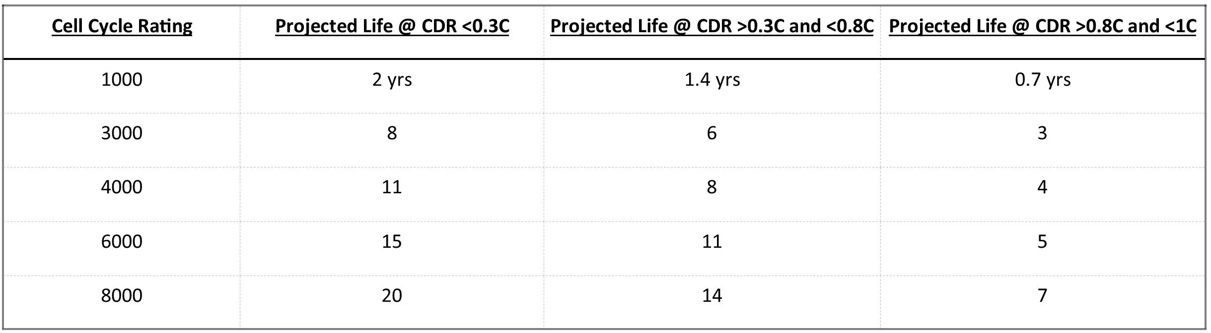 Cell Cycle Rating - Based on Standard ESS of 0.5C charge and discharge to 80% DoD, and 80% residual capacity.