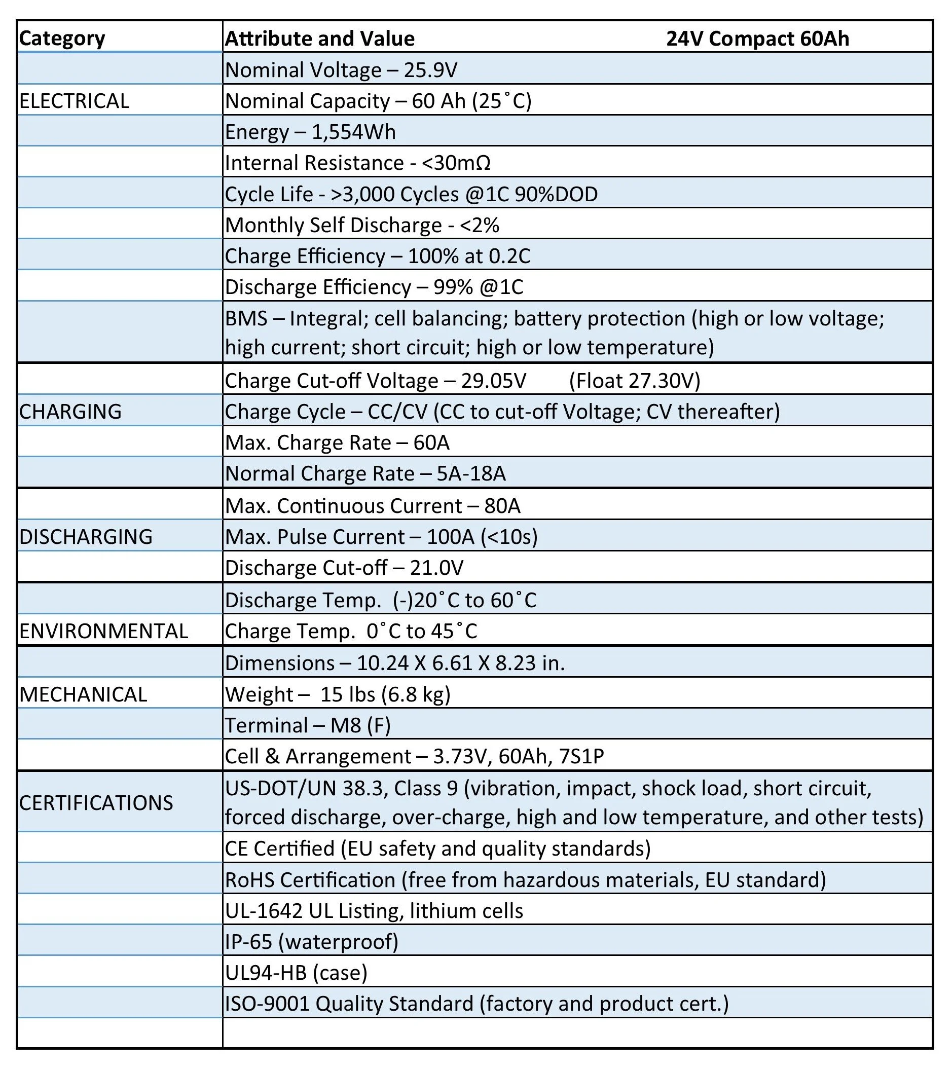 12.8V — 210Ah — Max. Charging Rate- 80A — Max Discharge Rate - 100A — Rated Cycles – >6,000