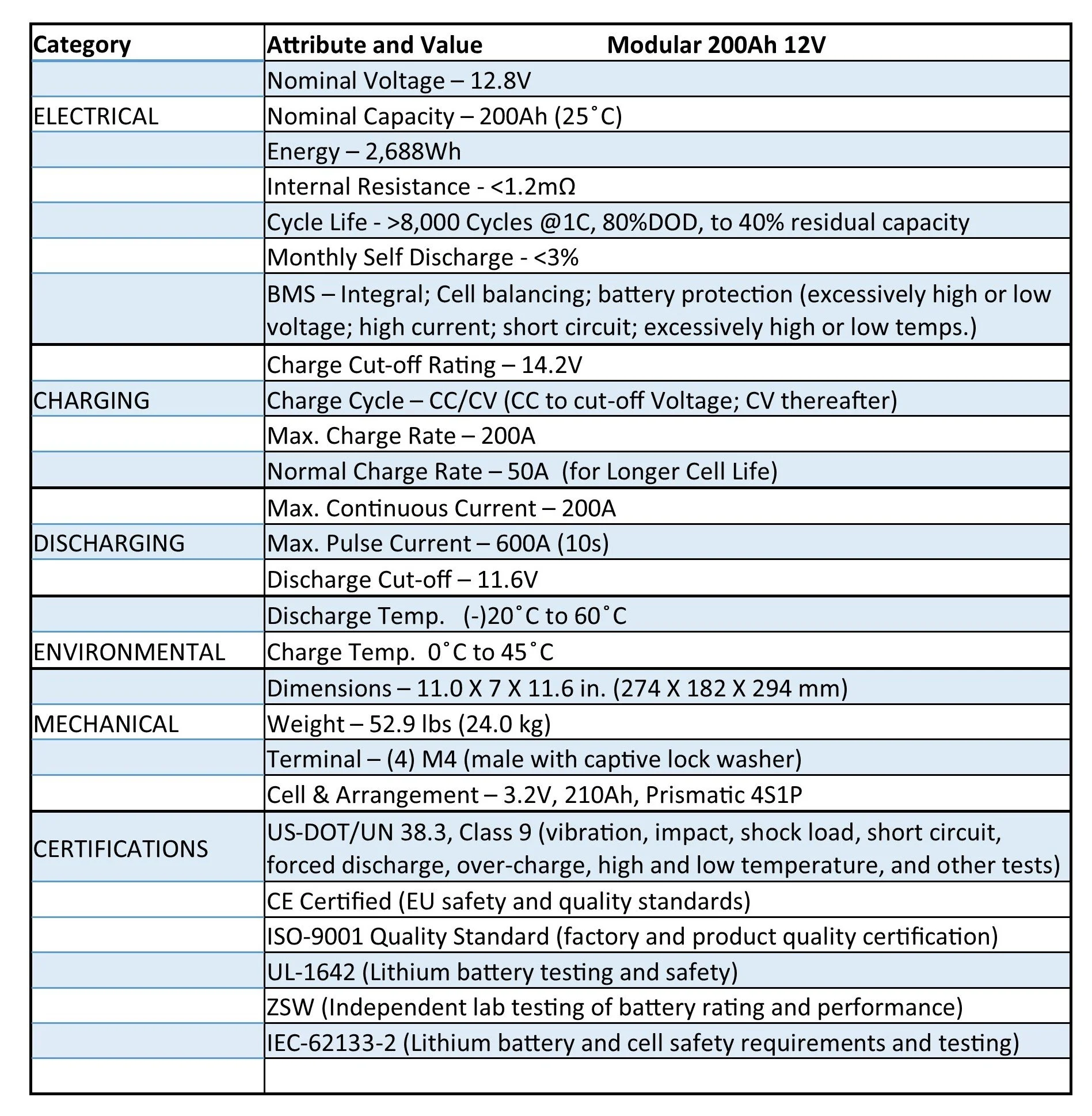 12.8V — 210Ah — Max. Charging Rate- 200A — Max Discharge Rate - 200A — Rated Cycles – >8,000